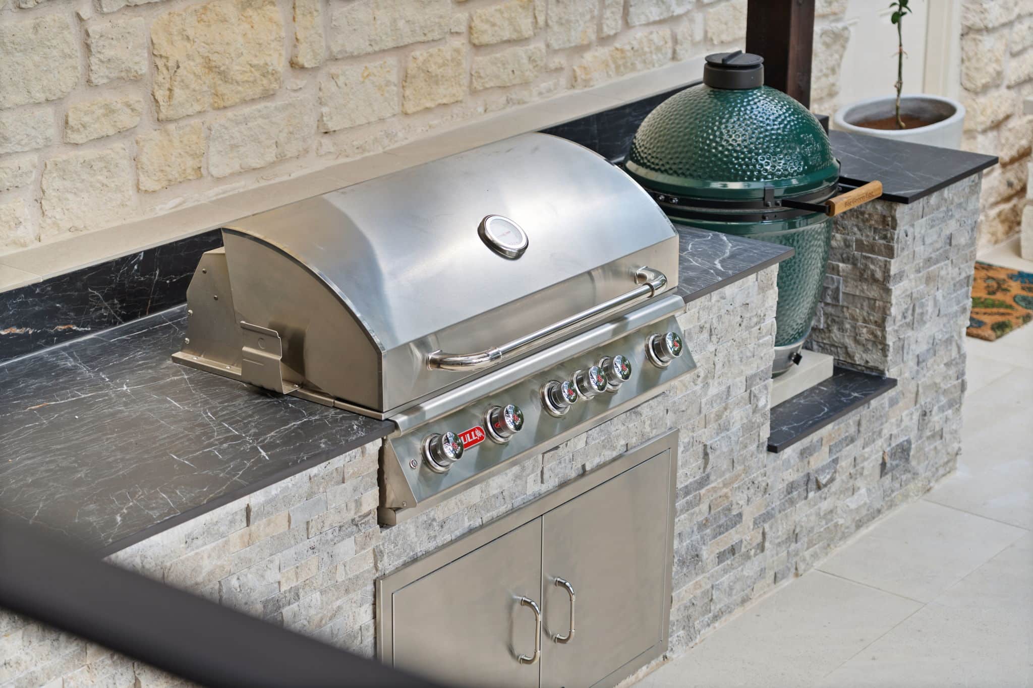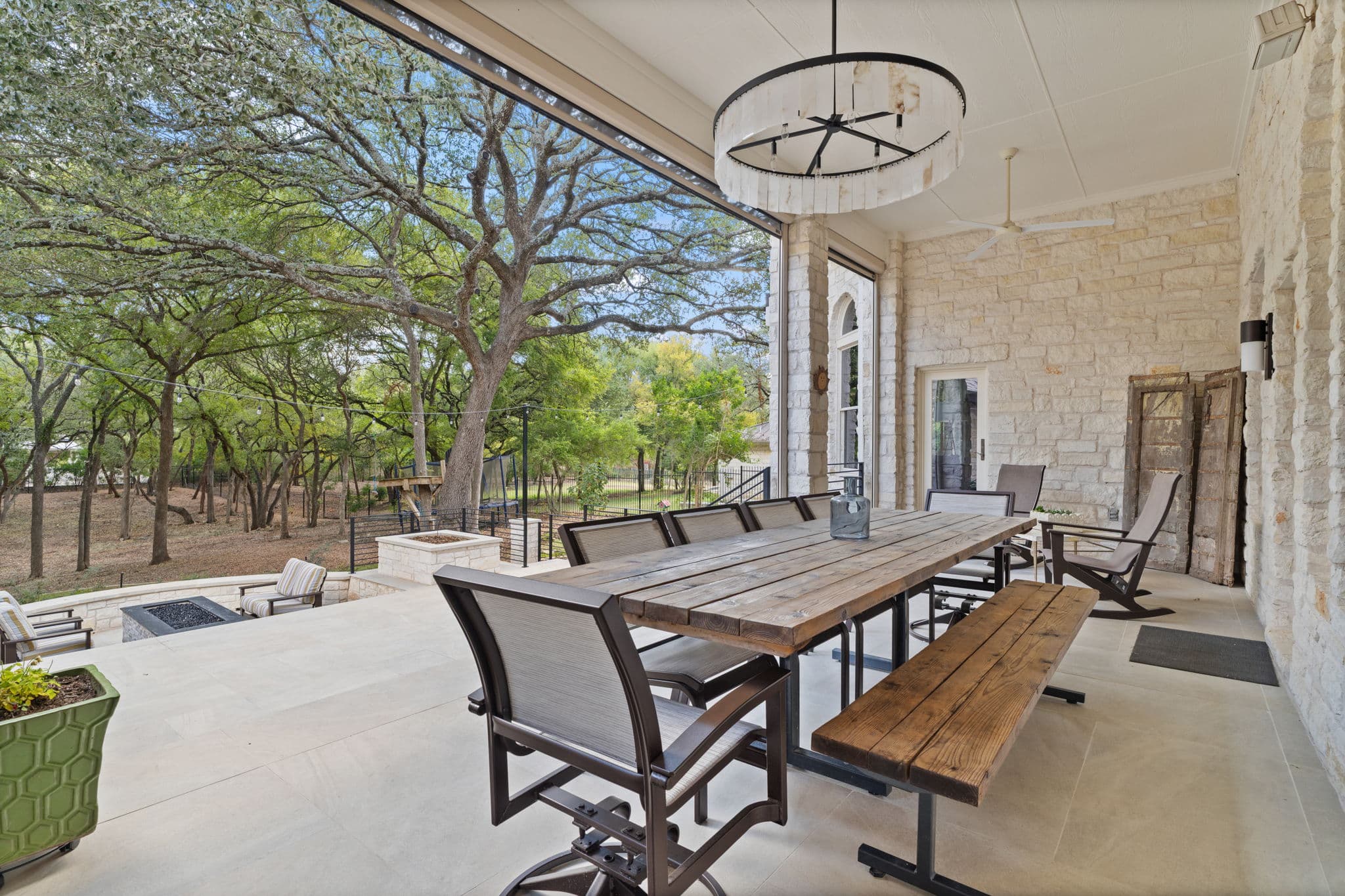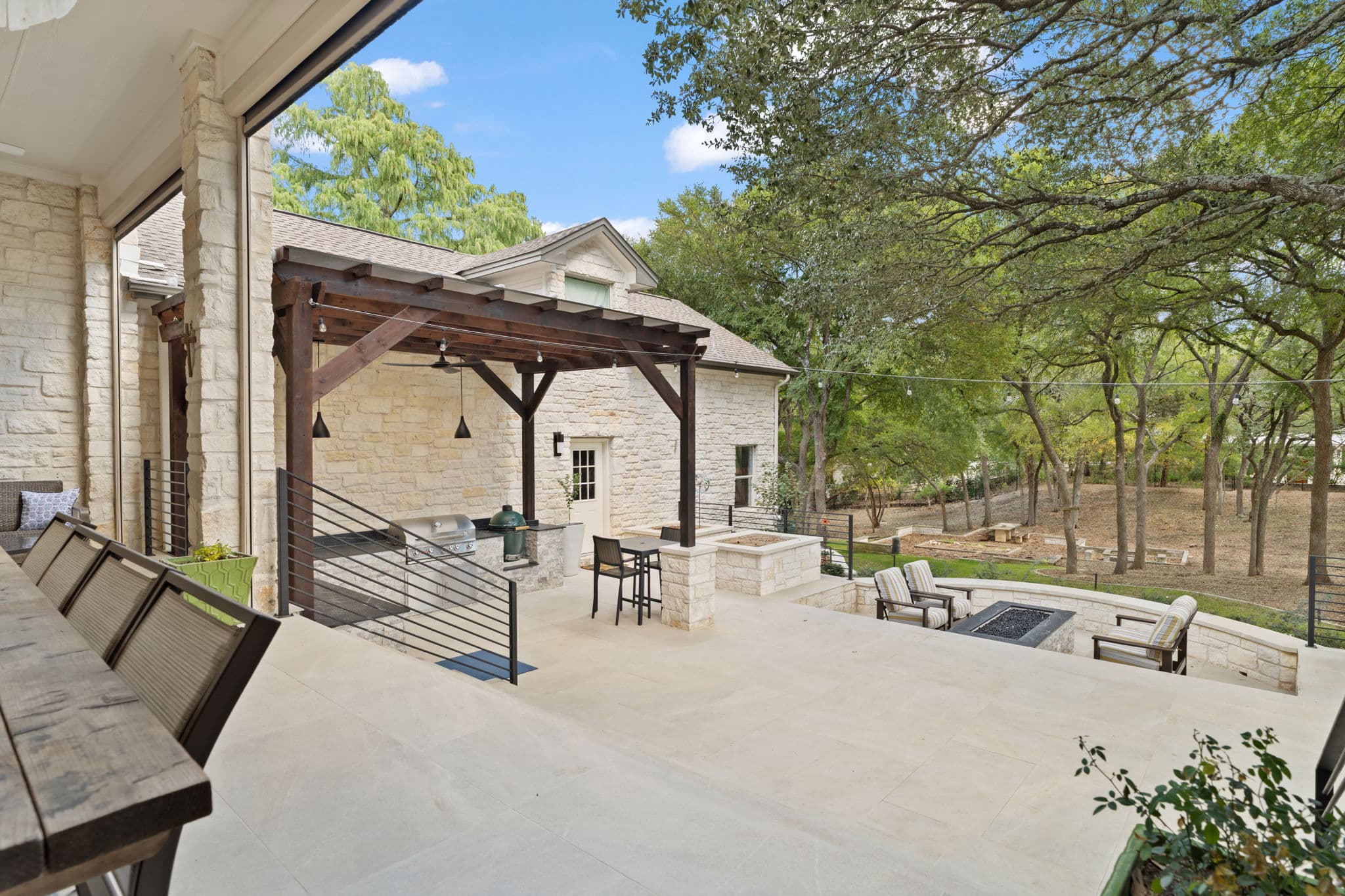 Additionally, high-performance materials such as Dekton countertops, top-tier appliances, and Italian-imported tile were selected for the custom fire pit and outdoor kitchen features, ensuring longevity and timeless appeal. Custom craftsmanship, evident in custom-welded railings and precision tile alignment, showcased meticulous attention to detail. Rigorous compliance with West Lake Hills standards was maintained throughout design and construction, requiring extensive coordination and on-site collaboration.